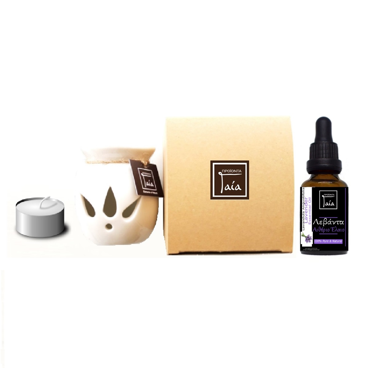 Το Gift Box περιλαμβάνει λευκή κεραμική συσκευή καύσης αιθέριων και αρωματικών ελαίων, λευκό κερί ρεσώ και αιθέριο έλαιο Λεβάντα 5ml ή 10ml σε gift box.