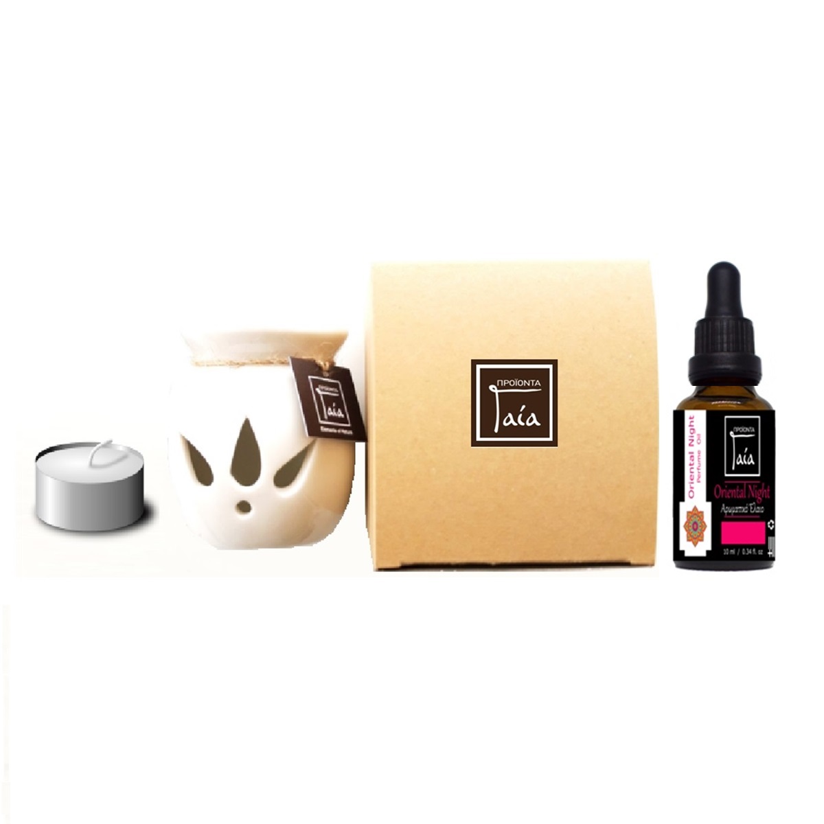 Το Gift Box περιλαμβάνει λευκή κεραμική συσκευή καύσης αιθέριων και αρωματικών ελαίων, λευκό κερί ρεσώ και αρωμτικό έλαιο Oriental Night 10ml σε gift box.