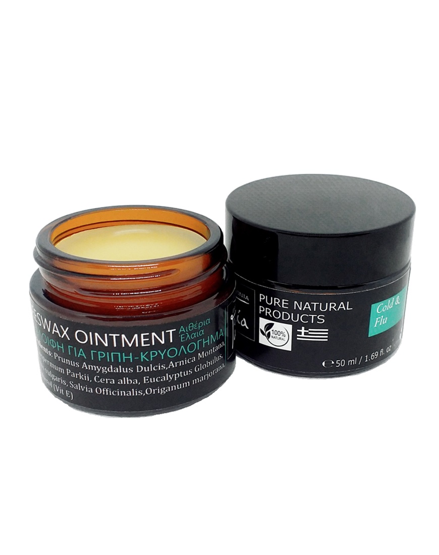 Η Κεραλοιφή Cold & Flu είναι 100% φυτική, δεν περιέχει νερό και ως εκ τούτου δεν έχουν προστεθεί χημικά για τη συντήρηση της. Περιλαμβάνει καθαρό κερί μέλισσας, Αμυγδαλέλαιο, έλαιο Άρνικα, βούτυρο Καριτέ και αιθέρια έλαια Ευκάλυπτο, Φασκόμηλο, Μαντζουράνα, Θυμάρι και βιταμίνη Ε. Το κερί μέλισσας από το είδος Apis Mellifera έχει αντισηπτικές, αντιφλεγμονώδεις, μαλακτικές και επουλωτικές ιδιότητες ενώ βοηθά το δέρμα να αποκτήσει απαλότητα και ελαστικότητα.